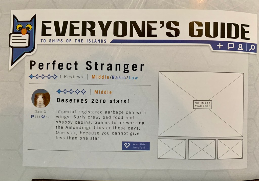 “Sure, I’ve heard of that ship,” exclaims a local dockworker. He fumbles for his comm pad and shows Jerome an entry in Everyone’s Guide for The Perfect Stranger. It’s not favourable.
