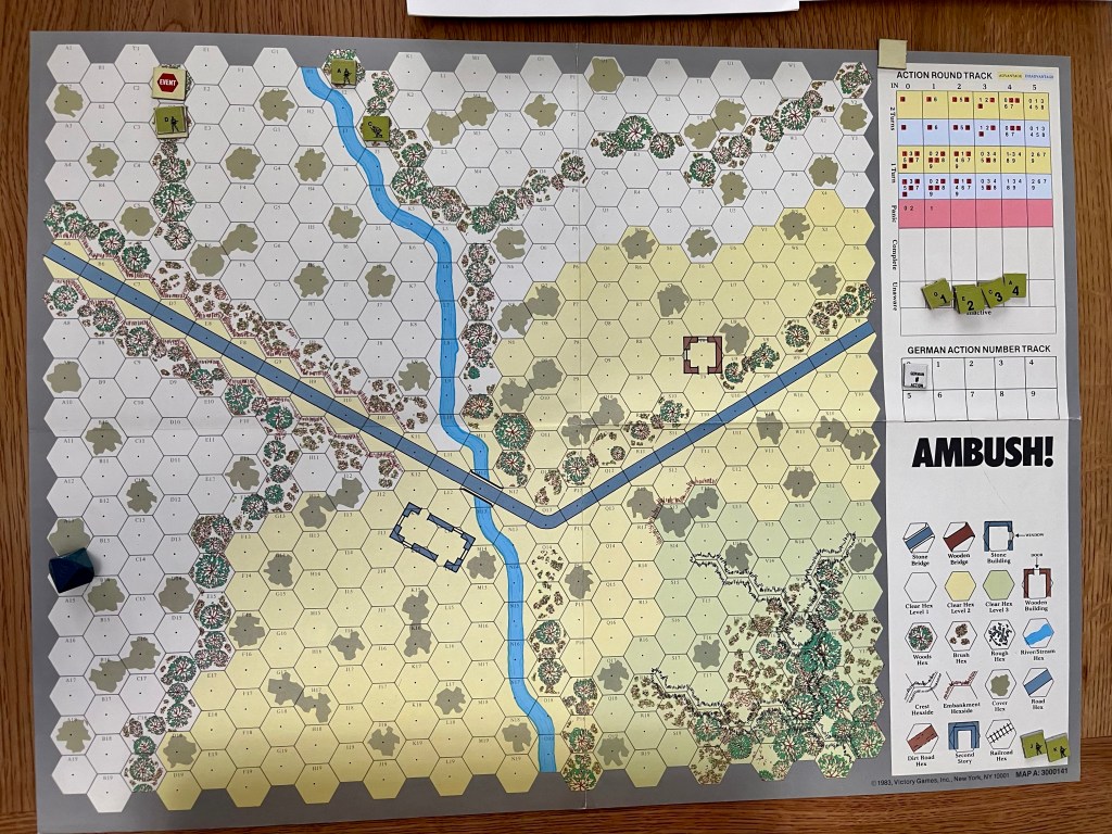 For the first time in about 30 years or more, Dad and I set up a game of Victory Games’ “Ambush!” and have been playing all afternoon. It’s a tense and entertaining game in which we have an 8-man squad of US soldiers in France 1944, advancing to capture a couple of buildings and a ridge line in the far south-east side of the map.