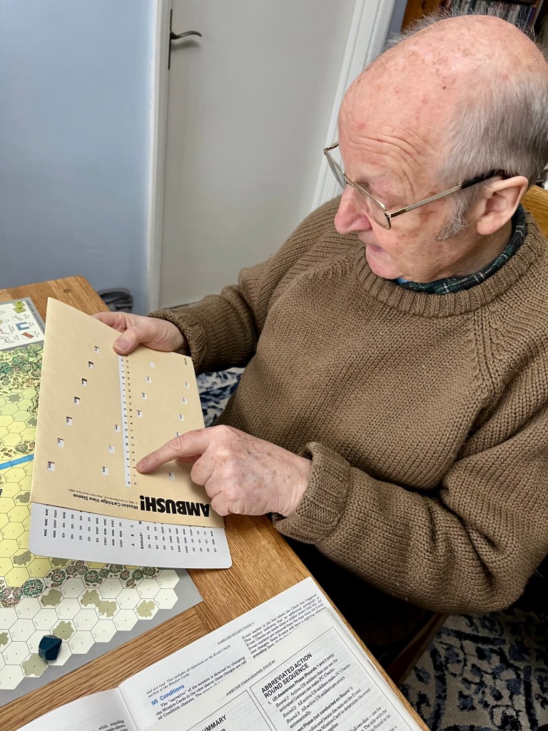 “Ambush!” rides very close to the line between a traditional solitaire wargame and what might be considered a roleplaying game. You have individual soldiers with multiple attributes, you choose weapons, track ammo through a form of usage dice, and are encouraged to name each one. In fact, as we played, one of Dad’s soldiers has become labelled as the Hero because of daring moves he has successfully pulled off.