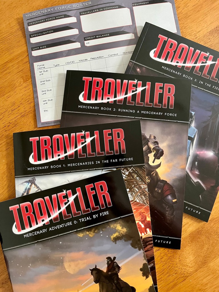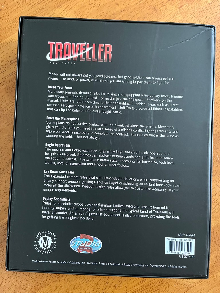 Quick photo update to mark the arrival of Mongoose Traveller’s “Mercenary” boxset today, here in Nottinghamshire UK. I’ve been eager to receive this one because I have long wanted to play some military SF and this product delivers that punch.