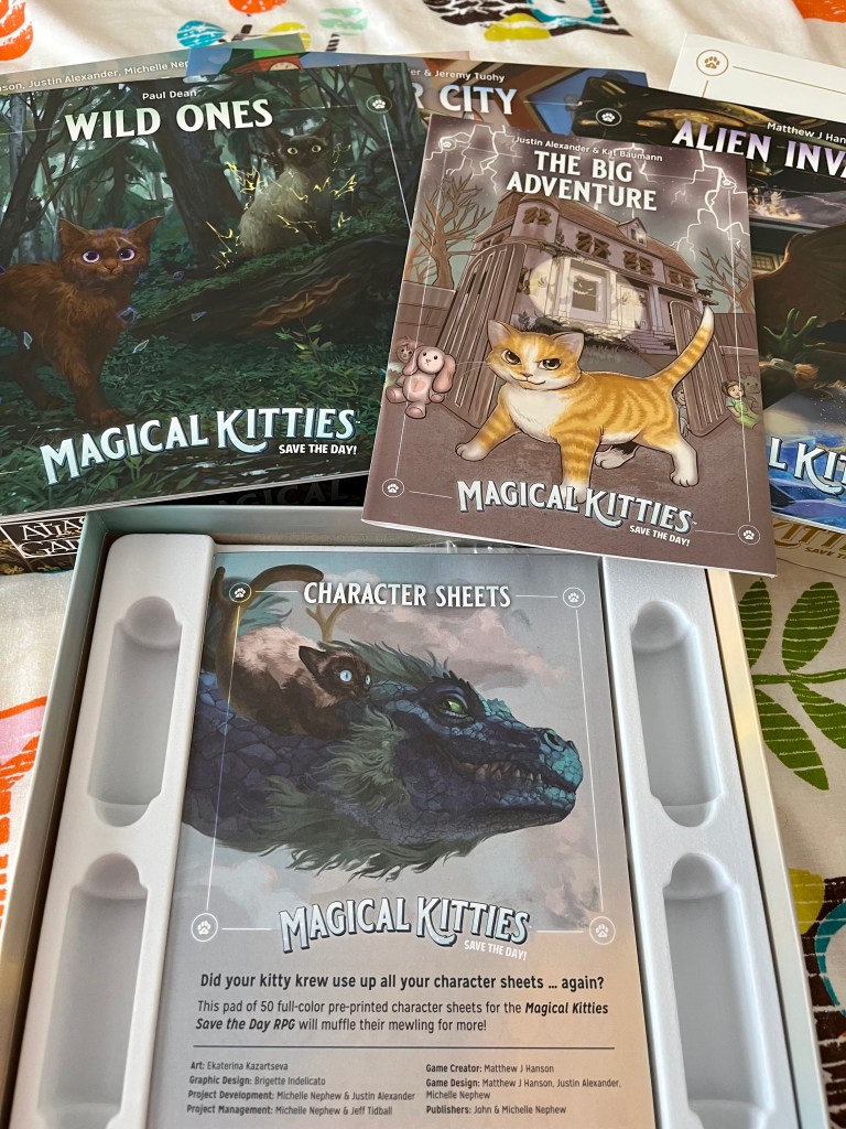 The box has three adventure booklets – the default River City setting plus Alien Invasion and the Wild Ones. The first is anytown on a river and is designed to provide a firm foundation in the genre for new players. Alien Invasion is pretty much what it says – protect the humans from aliens. The Wild Ones introduces kitties who don’t have a human but protect other wild animals instead, living in the wilderness.