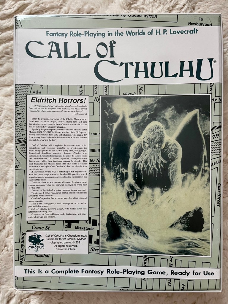 Another product tease tonight as my copy of the reprinted Call of Cthulhu Boxed Set arrived. Being a person who never got into Cthulhu until I was much older, and still hasn’t played more than a few isolated scenarios, I’ve been looking forward to this as my gateway into running the Mystery Scenario Structure.