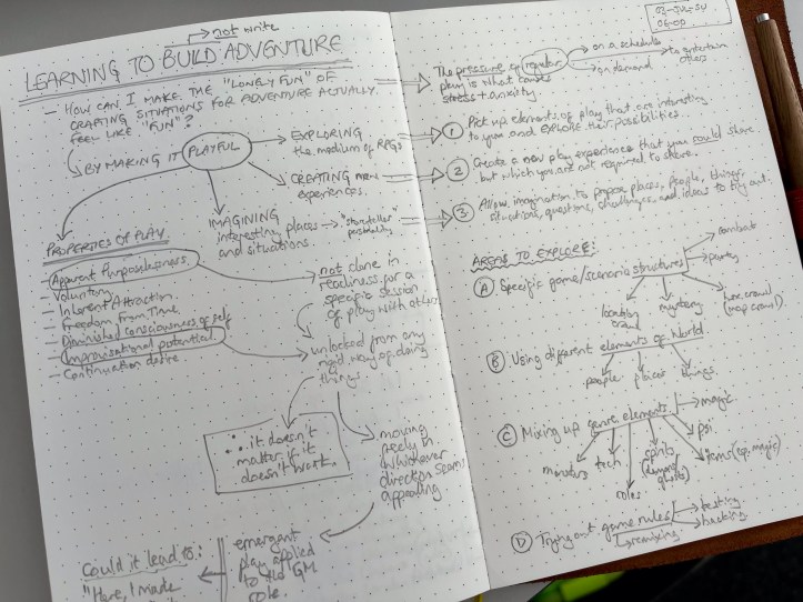 The main thing is to put aside time to play as the GM, not focus entirely on solely prepping for specific calendared sessions. Playfulness comes from the thing we are playing have no immediate apparent purpose. Once we’ve created something, we can always revisit it and fit it in to our regular campaigns if we so choose.