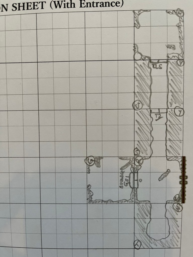 Time advances by 1. Standing in the entry cave, Goriel decides to forego the boulder ahead and turns to his left and check out the tunnel. I physically turn the dungeon sheet to place this exit at the top, then roll on the mapping table, scoring… 64. It’s a small cave that appears empty (it’s a Yellow = Empty location). Goriel decides to search it, rolling… 83. He spies a small stone which appears to be hiding an alcove, inside of which is a small spellbook with two spells. I roll twice on the Spells table to see what’s there… 07 means the Resurrection spell and 66 means the Clumsy spell. Goriel can’t use spells yet because his Intelligence is below 50, but these are good finds nonetheless.