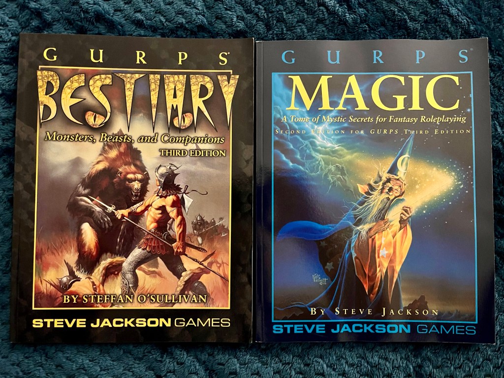 Faced with the need to recreate the character, I decided to switch things up a bit to suit myself. I grabbed the GURPS 3e rules and three supplements upon which to base my play – GURPS Ice Age, Bestiary, and Magic. Of course, I was drawn to the earlier 1st edition copies of the latter, so I will probably end up substituting in the later versions once play gets under way.