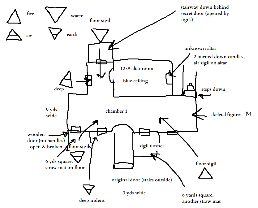 Symbolism was an important aspect of the play on Saturday night when the group first penetrated the half-buried ziggurat which they were tasked with exploring. I love how Arlen’s map details the Elemental symbols that they discovered and notes key features of the rooms. This gives us a strong impression of the space and suggests that meaning might be found in the details.