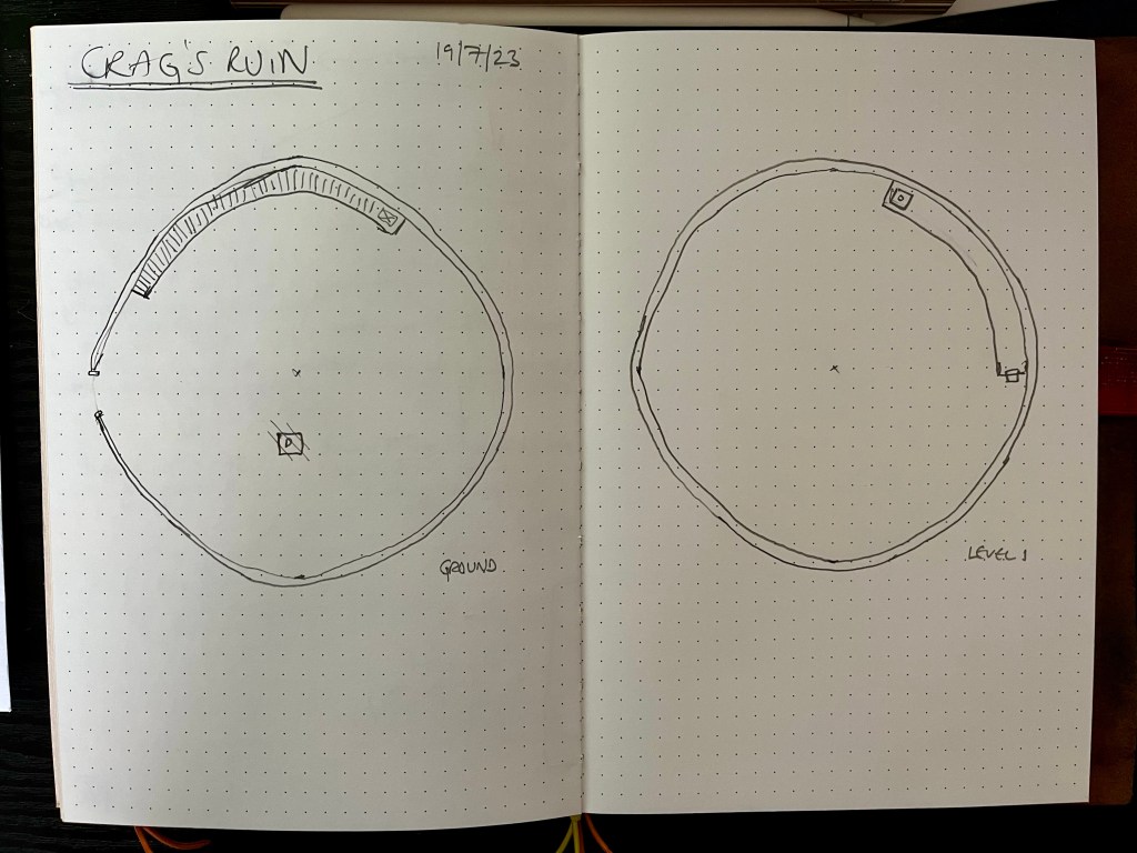 Because I was reviewing the notes from the fifth session of Crag’s Ruin today, I felt it would be helpful to quickly sketch out the map (so far) of the location. This led to me grabbing my note book and drawing a scrappy map to help me get a sense of the place.