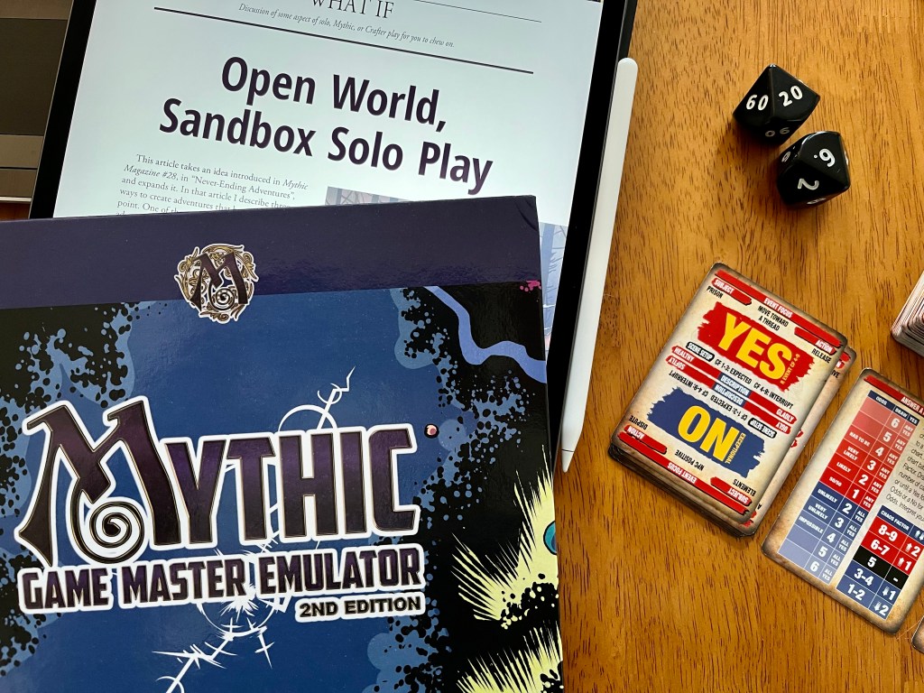 As soon as Mythic RPG Second Edition releases, I will go mine it for ideas. As the revised GM Emulator Deck similarly becomes available, I will see about upgrading that too. But for now, I have all the tools I need. I’m coming back to the core Mythic GM Emulator and using those tools to run game solo.