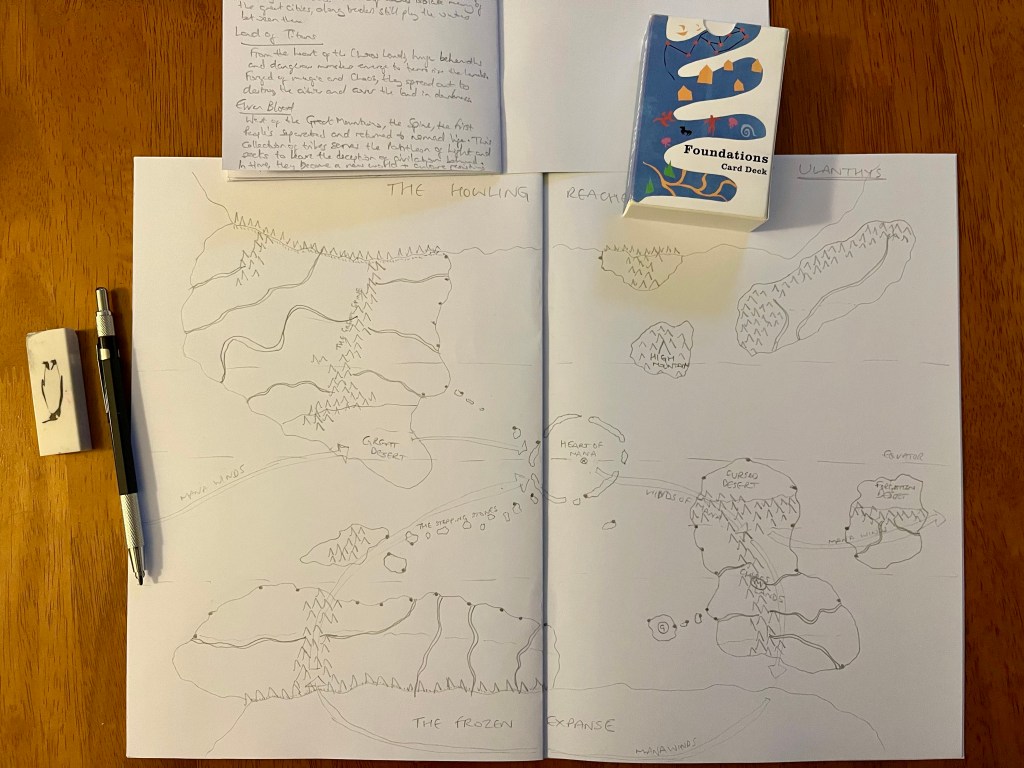 Although my latest world is not complete, retaining the card deck for a second session has proven trivial and offers the chance to return later in the week. What is interesting is the emergent story of the world – born as it was Ulanthys as a single continent, now fragmented in the wake of several huge transformative events.
