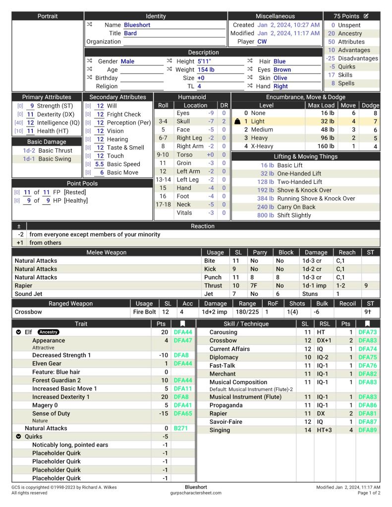 I’ve been extremely loose with this translation across systems, interpreting a Charisma score of 4 as not having the Charisma advantage for example. I’ve also largely ignored the D&D Elf’s infravision, just taking the default DFRPG Elf template as written. That gives him Magery 0, an ability that is probably just dead points.