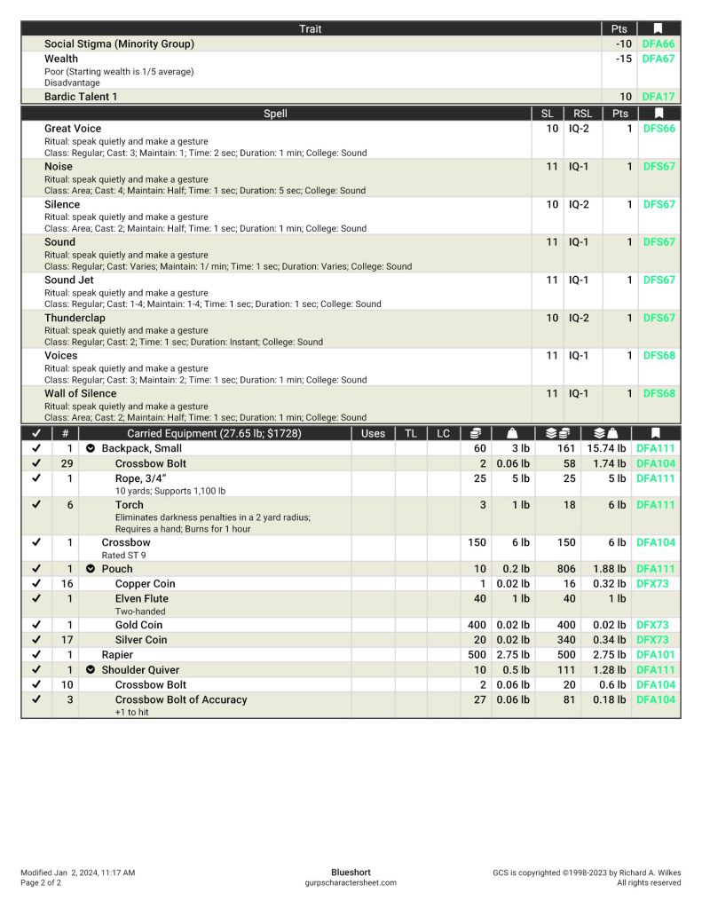 To be clear, I typically dislike the idea of the D&D Bard and it took an effort of will to choose to make Blueshort fit that mould in DFRPG. Once I took the plunge, however, I found it all pretty entertaining to create.