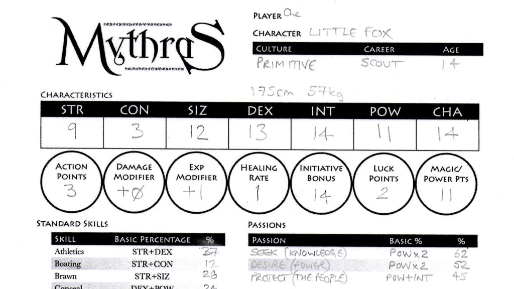 Here we meet an additional consideration: the Height and Weight of the character, something overlooked in Imperative. These are assigned based on SIZ and a choice of three body frames – Lithe, Medium, and Heavy. As these are Primitive culture characters who are not overly athletic, I am going to assume Lithe frame.