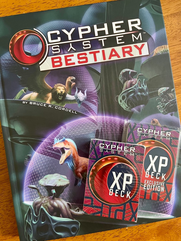 Revisiting the Cypher System in preparation for running a game at the school gaming club in a couple of weeks coincided with the arrival of the Cypher System Bestiary. On top of that, I’ve been playing around with the Cypher System Character Builder, which is an amazing tool. All in all, it’s been a good day for me as a GM.
