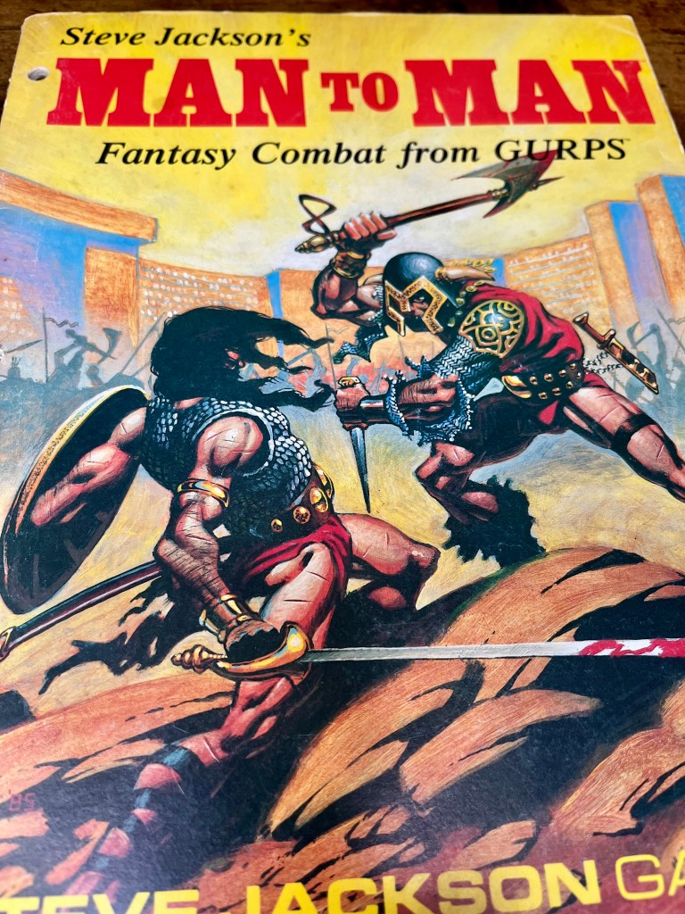Man-to-Man by Steve Jackson Games was published in 1985 as a foretaste of the eventual arrival of GURPS Basic Set in 1986. There is something about that old booklet that inspires in me the desire to knock up a couple of fighters and set-to in the arena with those combat rules. For all my pretensions of being a roleplayer, Man-to-Man exposes my inner wargamer.
